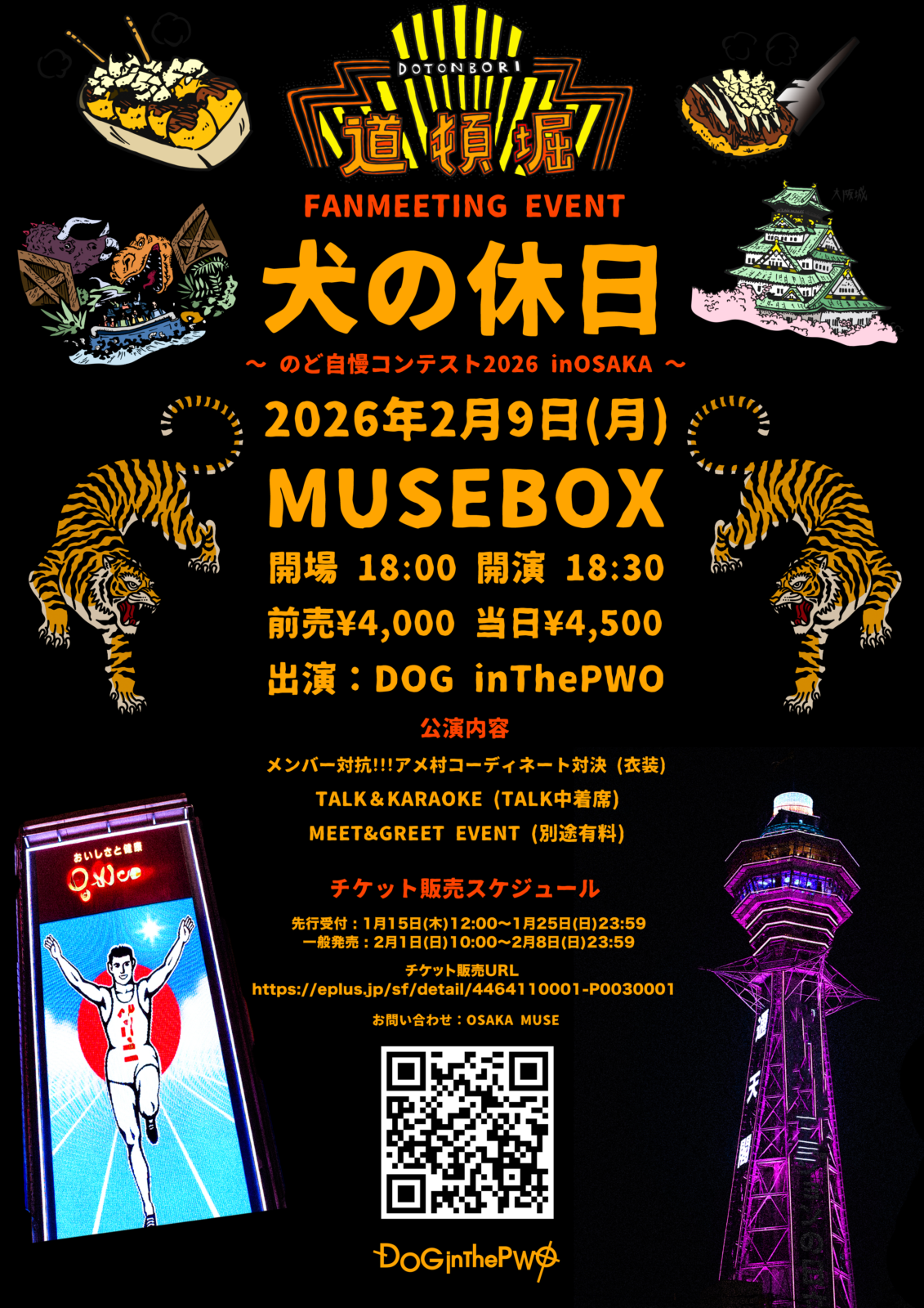 FANMEETING EVENT「犬の休日〜のど自慢コンテスト2026 in OSAKA〜」開催決定 2026.01.09 FANMEETING EVENT「犬の休日〜のど自慢コンテスト2026 in OSAKA〜」 ■公演日:2月9日(月) ■会場:MUSE BOX ■開場 / 開演: 18:00 / 18:30 ■出演:DOG inThePWO ■公演内容:メンバー対抗!!!アメ村コーディネート対決 / TALK & KARAOKE ※トークイベント中着席 / MEET & GREETあり 公演詳細、チケット販売詳細はSCHEDULEにてご確認ください。 ポストする LINEで送る シェアする « PREV 一覧に戻る NEXT »